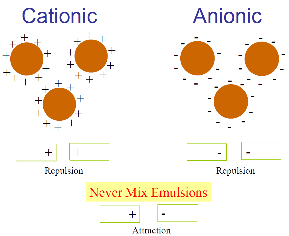 Almost all surfaces have a net negative charge. The strength or intensity of this negative charge may be different from material to material. Because of this phenomenon, anionic and cationic emulsions break in different ways.