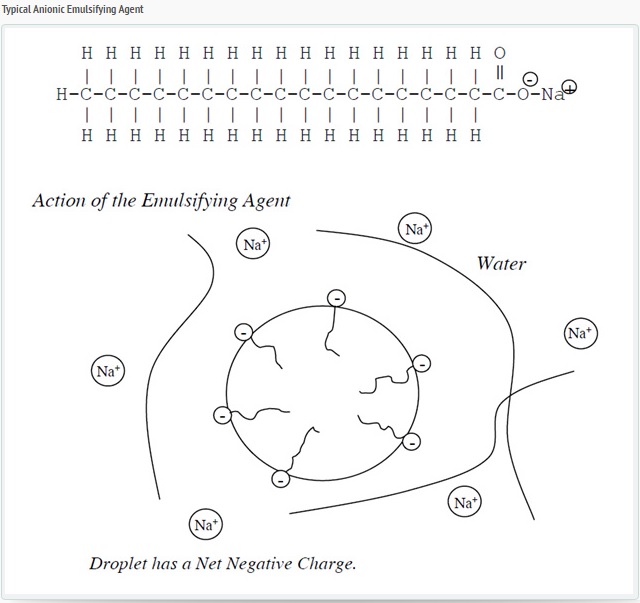 The most common anionic emulsifiers are acids, which are wood-product derivatives such as tall oils, rosins, and lignin’s. Anionic emulsifiers are saponified (turned into soap) by reacting with sodium hydroxide or potassium hydroxide.