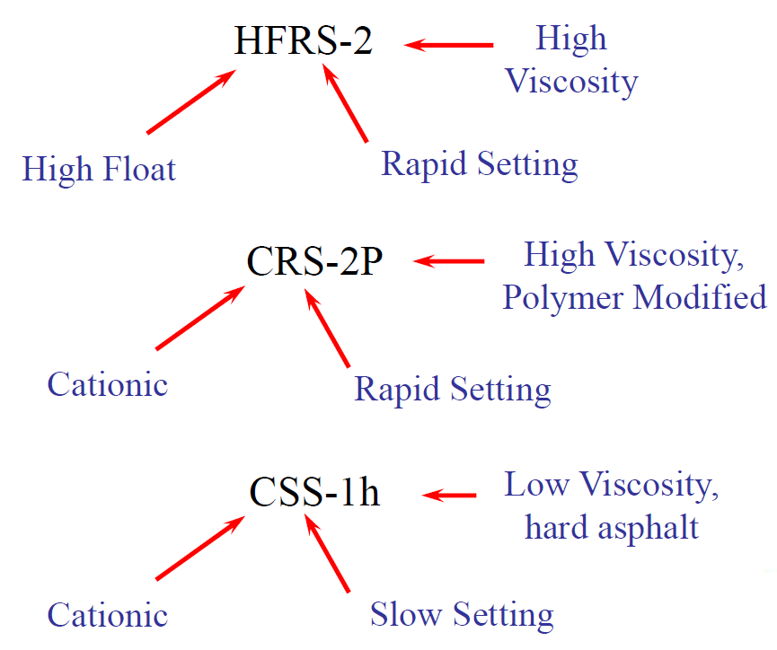 The numbers in the classification indicate the relative viscosity of the emulsion. For example, an MS-2 is more viscous than an MS-1. The “h” that follows certain grades simply means that harder base asphalt is used. An “s” means that softer base asphalt is used.