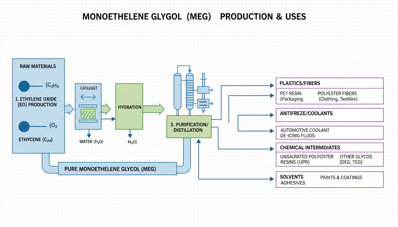 Mono Ethylene Glycol (MEG) is a colorless, odorless, and hygroscopic liquid chemical with the formula C₂H₆O₂, produced primarily by the hydration of ethylene oxide. It is one of the most important intermediates in the chemical industry, widely used in the production of polyester fibers, polyethylene terephthalate (PET) resins for bottles and packaging, and as a key ingredient in automotive antifreeze and coolants.
