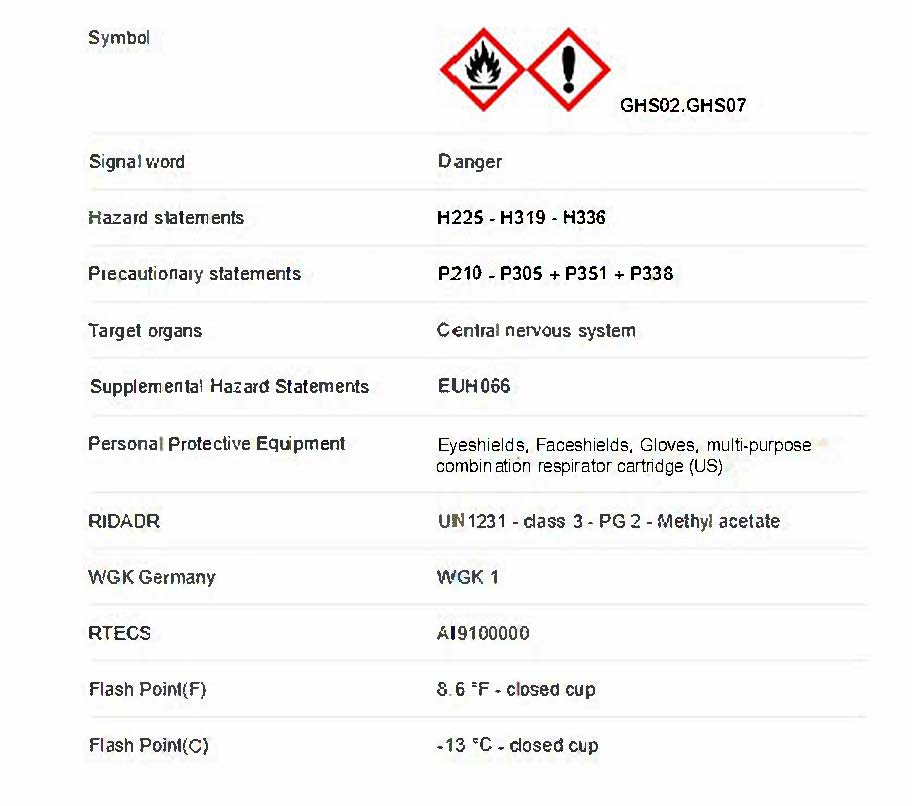 It is a clear, colorless liquid that has a typical ester odor similar to glues and nail polish removers. It is very flammable with a flashpoint of -10° C and a flammability rating of 3.